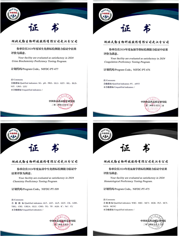在血清中生化指標(NIFDC-PT-509)、血液學指標(NIFDC-PT-475)、血凝學指標(NIFDC-PT-476)和尿生化指標(NIFDC-PT-477)四個關鍵項目的能力驗證過程中,天勤生物武漢分公司提交了全部37個能力驗證指標,且所有項目均以滿分100分通過,最終獲得“滿意”的最高等級認定。在臨床檢驗領域,天勤生物武漢公司不僅配備了先進的儀器設備,還建立了完善的實驗室質量控制體系,并擁有一支高技能的專業團隊,這一系列優異的成績充分展示了天勤生物武漢分公司在臨床檢驗領域的扎實功底。