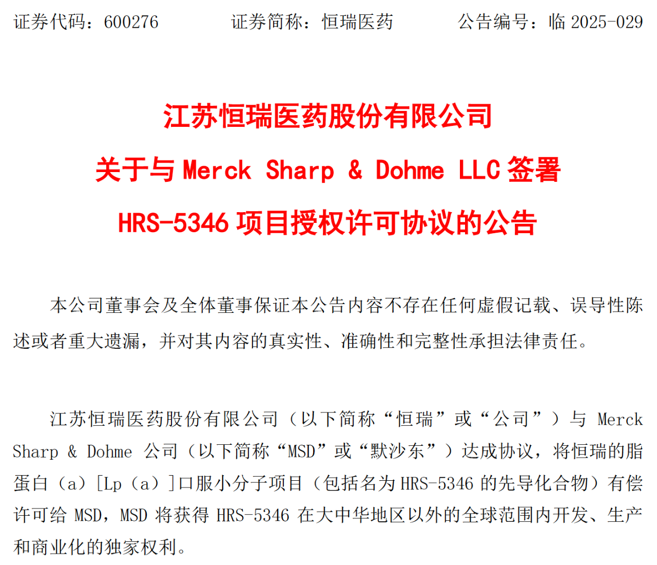 近日,恒瑞醫藥與全球醫藥巨頭默沙東就口服小分子Lp(a)抑制劑HRS-5346達成協議,該藥物在大中華區以外的全球開發、生產和商業化獨家權利已成功授權給跨國藥企默沙東,恒瑞醫藥將收取2億美元的首付款,并有資格獲得不超過17.7億美元的與特定的開發、監管和商業化相關的里程碑付款,以及如果相關產品獲批上市,基于HRS-5346的凈銷售額的銷售提成。這標志著中國本土創新藥研發實力再次獲得國際認可。